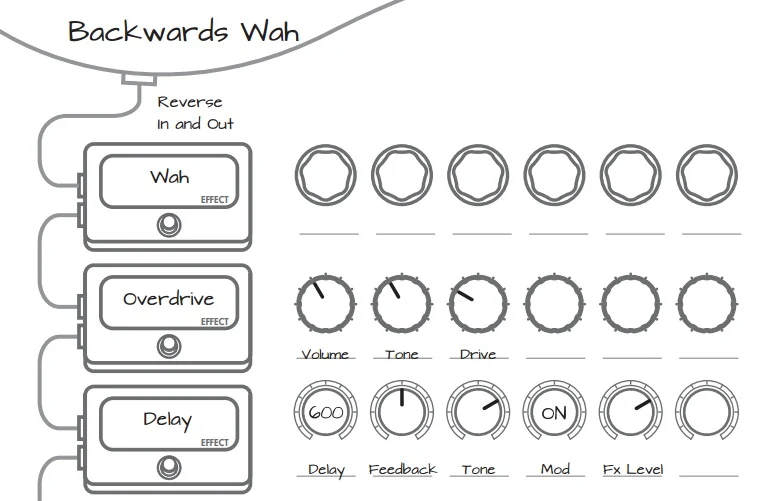 El pedal de Wah puede usarse de mil maneras y dándole cada vez una sonoridad particular. Utilizando esta disposición de pedales podemos conseguir el efecto característico que se escucha en mitad de la tema "Echoes" de Pink Floyd.